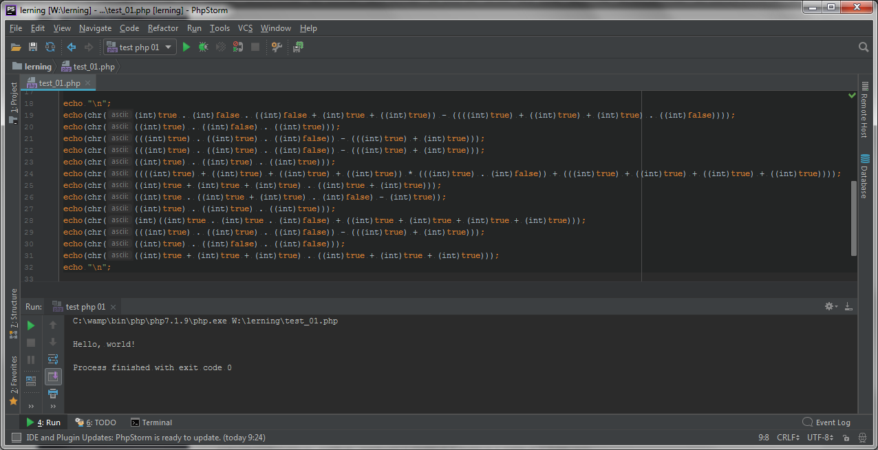 Выведем на экран без использования явно указанных цифр и символов "Hello, world!" =)